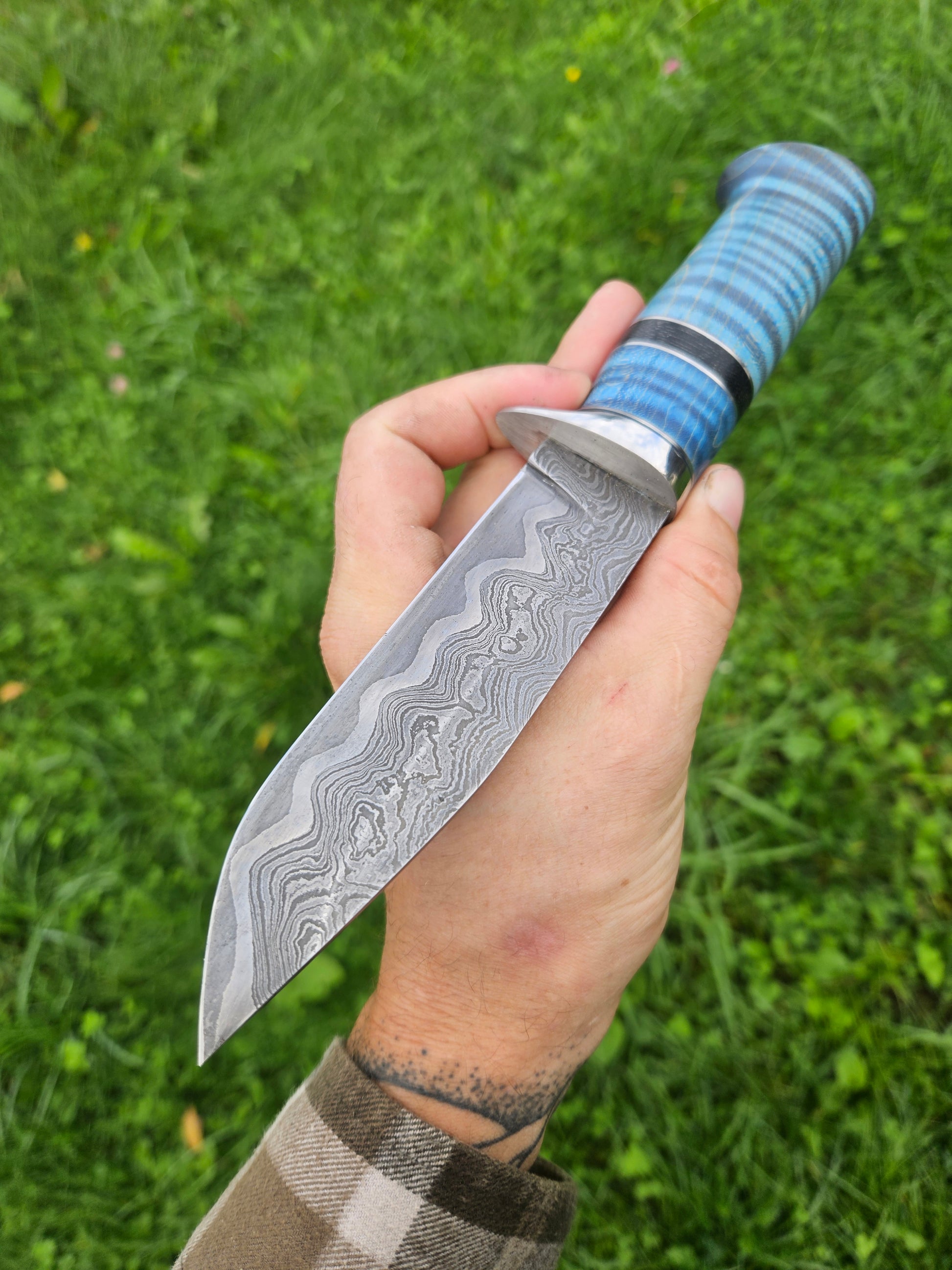 Handle Material: Stabilised blue curly maple, black micarta, stainless steel spacers, and guard