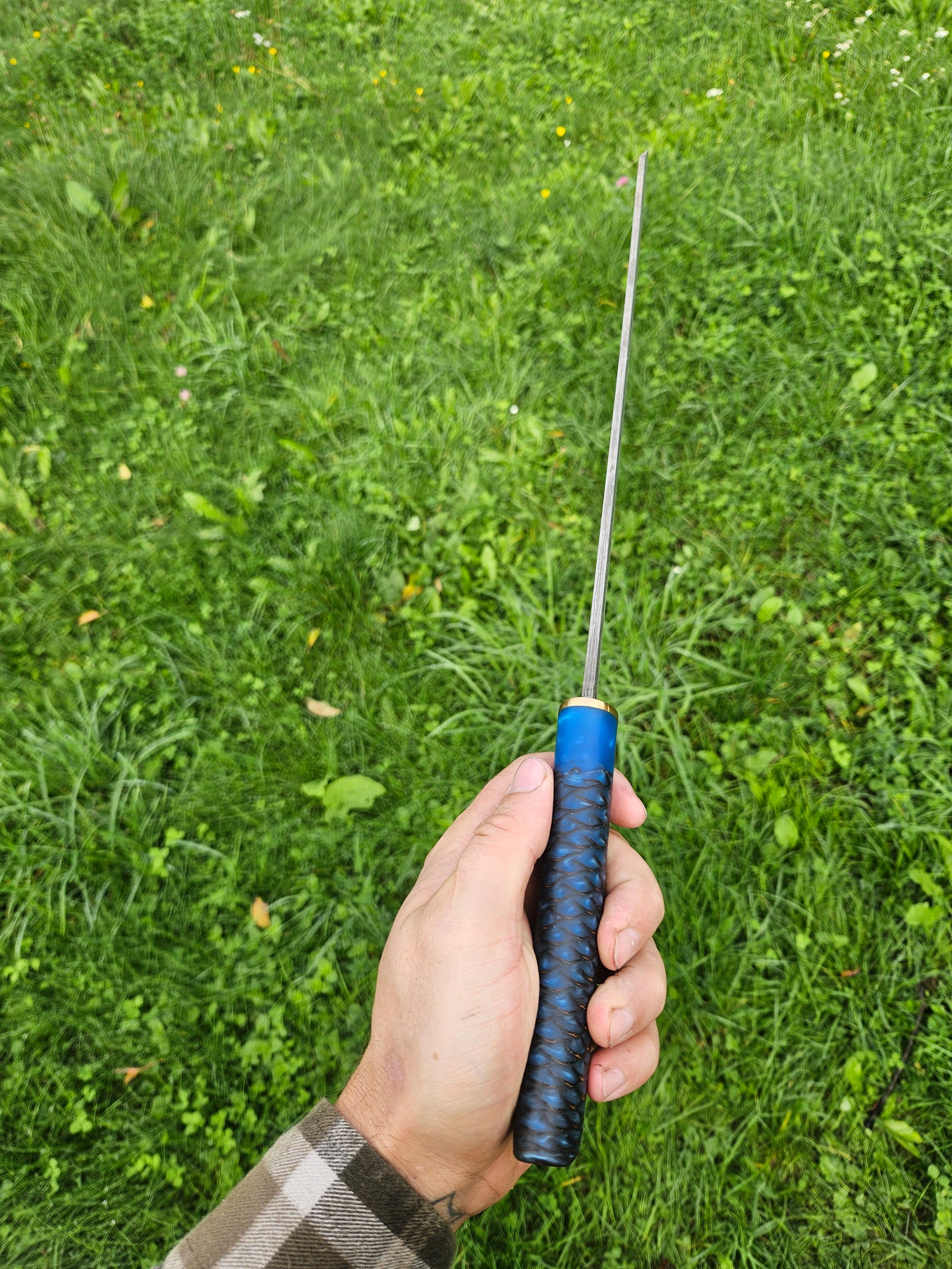 Handle Material: Brass and pine cone set in blue epoxy