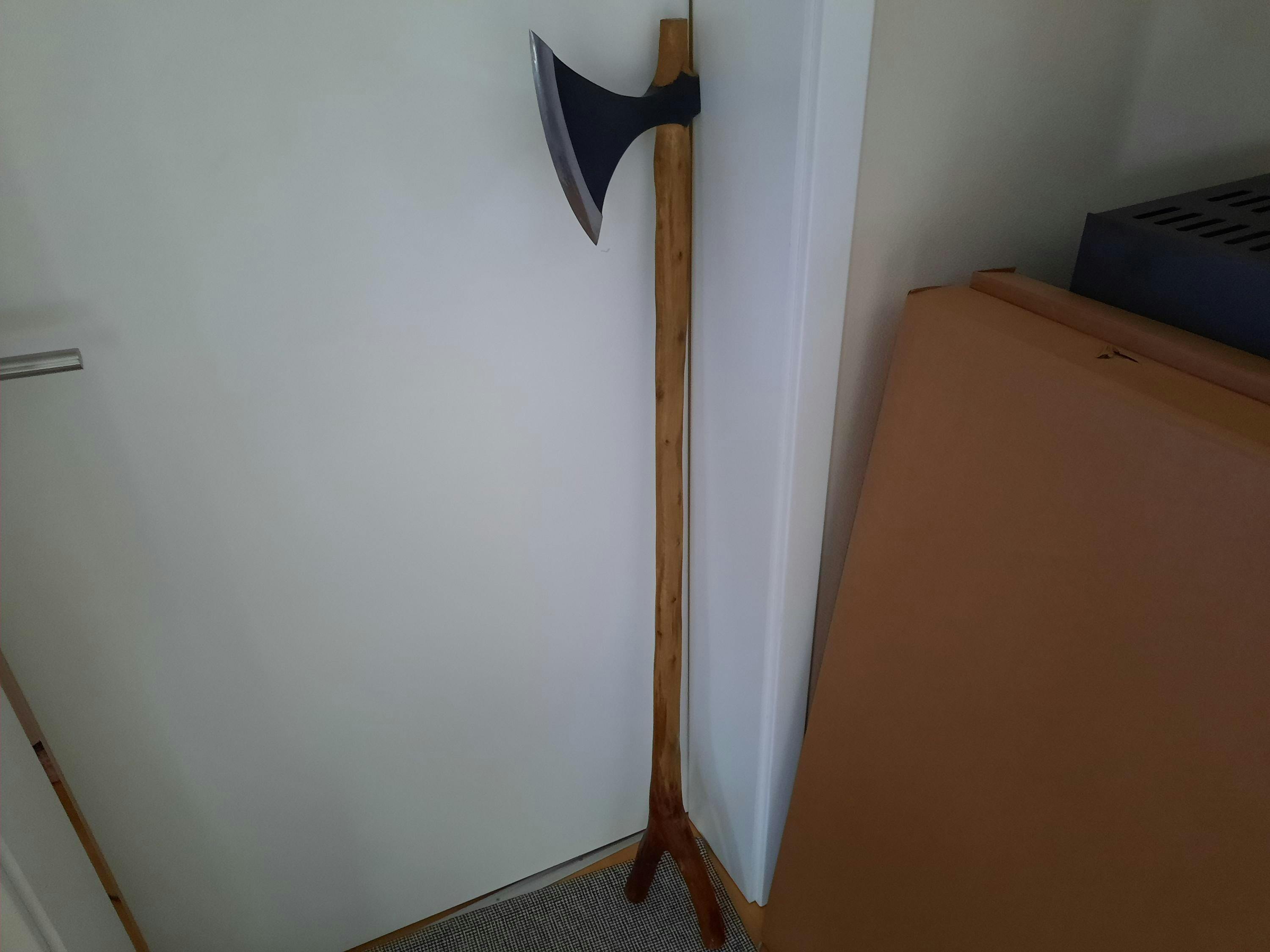 Den einzigartigen Stiel 'mit der Gabel' machte ich aus Hainbuche und dieser wiegt jetzt entgültig ca. 1370 Gramm (laienhaft getrocknet) und damit geschätzt 600-700 g mehr als die gewöhnlichen, sehr guten Stiele von Dan (NoricSteel).